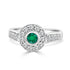 Elegant ladies' ring crafted in 14 karat white gold featuring a stunning round bezel-set emerald and surrounded by natural round-shaped diamonds. Delicately designed for a timeless and sophisticated look, this exquisite piece is sure to dazzle and delight. Perfect for adding a touch of glamour to any outfit.