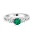 Elegant 14K white gold ladies' ring features a stunning three stone design with round-shaped natural emerald and dazzling natural diamonds. This exquisite ring embodies timeless beauty and sophistication, making it a perfect choice for adding a touch of luxury to any outfit.