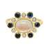 Elegant and exquisite, this 14 Karat Yellow Gold ladies' ring features a stunning Alt Sapphire cabochon surrounded by a halo of Natural Diamonds, Blue Sapphires, and Moonstones. With a unique oval design, this gemstone ring is a stylish statement piece that will dazzle and delight.