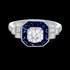 Elegant vintage sapphire engagement ring in 18K white gold featuring a halo of natural diamonds and side stones. This stunning piece showcases a vibrant blue sapphire gemstone and intricate cubic zirconia accents, a perfect blend of luxury and craftsmanship for your special moment.