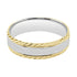 Elegant and sophisticated, this men's 10 karat two-tone wedding band features a striking yellow gold etching design. Perfect for the modern groom looking for a unique and memorable piece to symbolize his commitment and love. Showcase your style and devotion on your special day with this exceptional ring.